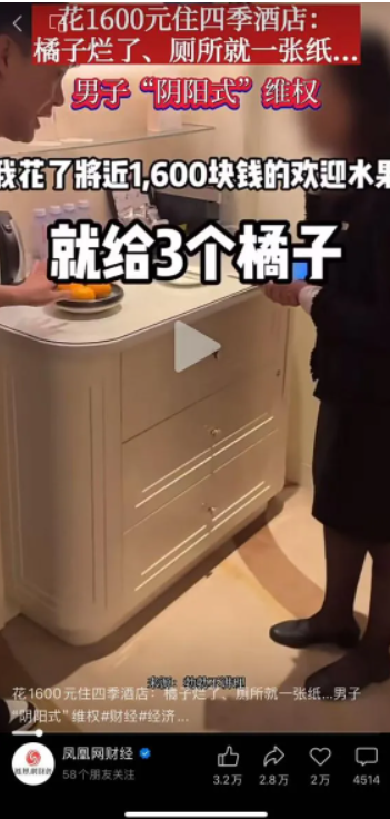 比如前段时间,有博主阴阳式维权,称自己花了1600块住四季酒店,欢迎水果就给3个不新鲜的橘子,厕所就一张纸......