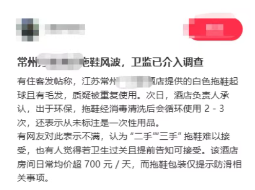 再比如,前段时间常州某知名高星酒店,被网友曝出重复使用一次性拖鞋,网友们不满的点在于该酒店日均房价超过700元,但用的拖鞋却是“二手”甚至“三手”货。