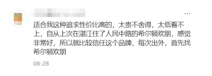 社交媒体上,有网友对希尔顿欢朋一见钟情:“太贵的不舍得,太低的看不上…自从住过后,感觉非常好,所以就比较信任这个品牌,每次出门在外,首先找希尔顿欢朋。”