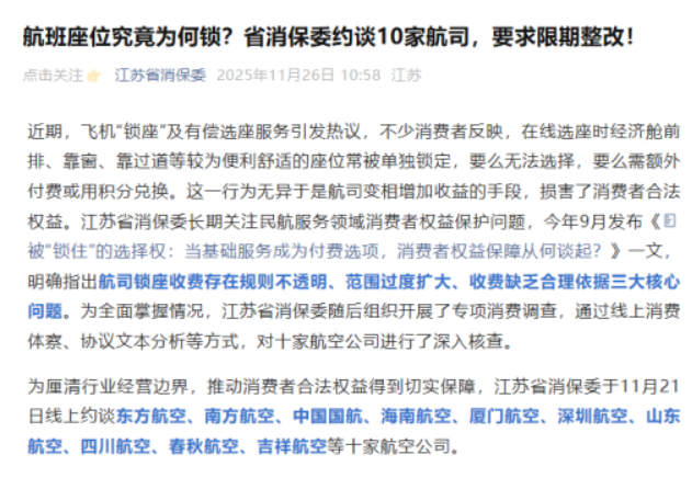 针对机票锁座问题,江苏省消保委要求各航司15个工作日内将整改情况以书面形式进行提交。