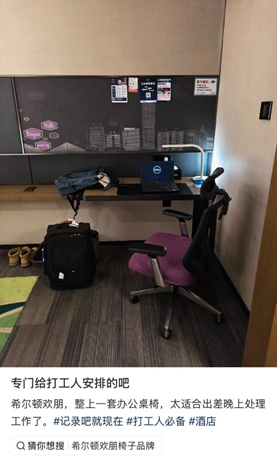 就像一位博主在帖子所里写的那样:“希尔顿欢朋,整上一套办公桌椅,太适合出差晚上处理工作了,专门给打工人安排的吧。”
