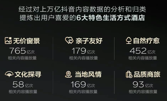 在捕捉用户酒店消费趋势上,抖音生活服务心动榜酒店给出了更具象的答案,经过对上万亿抖音内容数据的分析和归类,提炼出了用户喜爱的6大特色生活方式酒店的核心标签:“无价窗景”“亲子友好”“自然疗愈”“文化探寻”“当地风情”“品质商旅”。