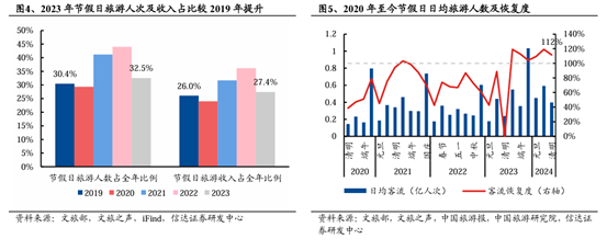 * 2019年节假日全国旅游人次和旅游收入占全年比重分别为 30.4%和26.0%,2023年则提升至32.5%和27.4%。