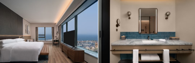 从左到右:大连东港福朋喜来登酒店客房、客房卫生间