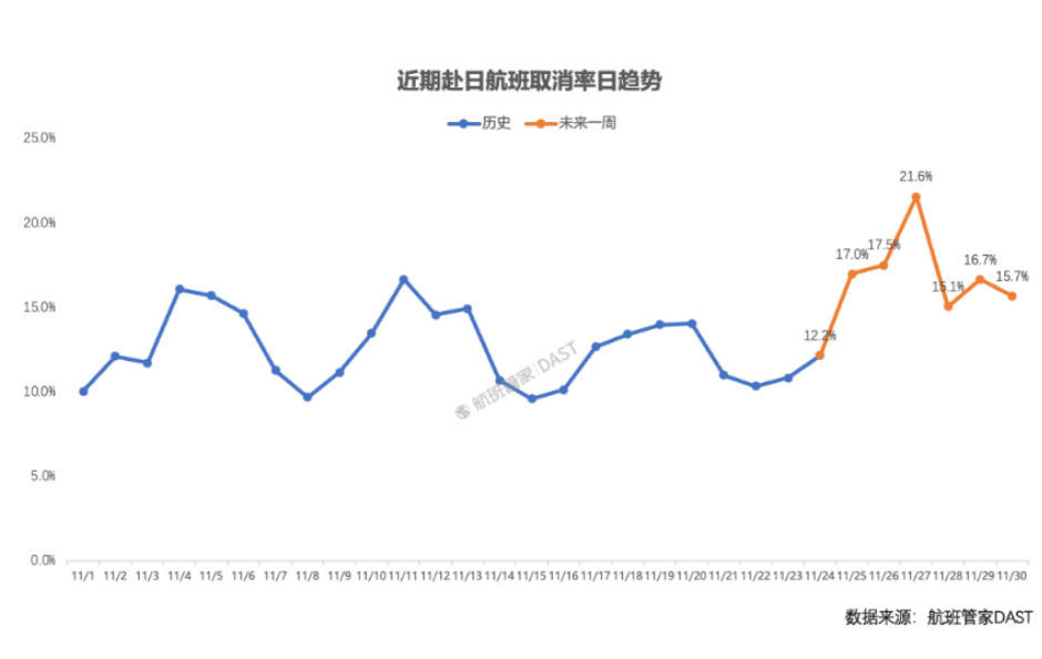 截至11月24日10时,12条中日航线已取消全部计划航班,11月27日赴日航班取消率将攀升至21.6%,创月内峰值。