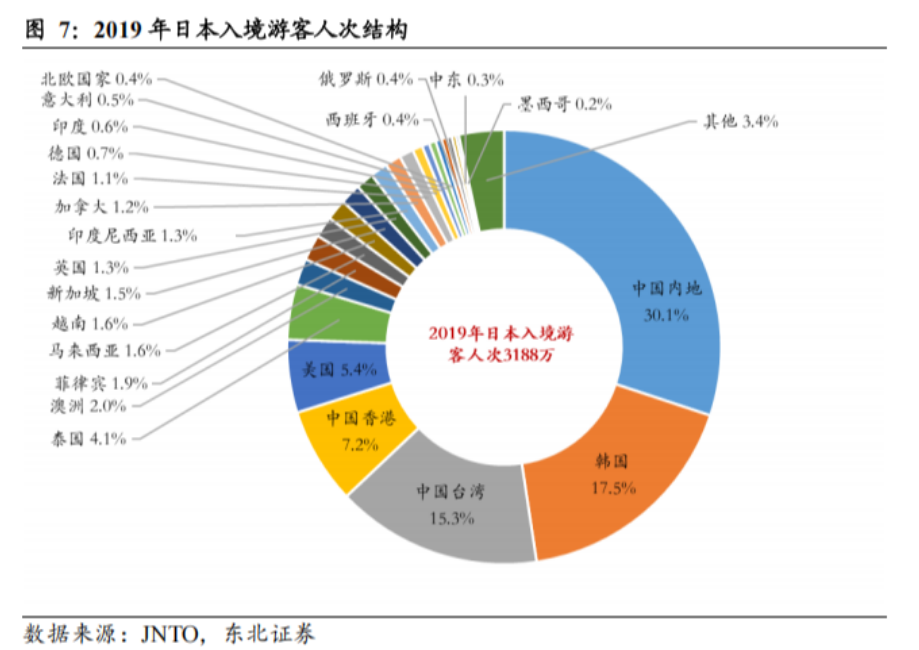 2012至2019年,日本入境游市场规模CAGR高达21%,2019年访日外国游客达3188万人次,其中中国内地游客占比30%,稳居第一客源地。