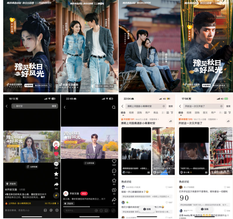 明星CP彭小苒与章时安的加入,为开封注入了鲜活的情感叙事。结合开封目的地文化属性,项目匹配热播剧《暗河传》热门明星CP,创新性地将剧中CP延伸到现实场景。拍摄当天,策划彭小苒章时安路透视频,开封文旅官方打call,迅速收获全网近2亿曝光,最高单条视频点赞量达55万以上。当天,#清明上河园偶遇彭小冉章时安 热点登上全国热点榜TOP27、全国娱乐榜TOP5、开封同城榜TOP1。同时#彭小苒章时安清明上河园、#开封版泰坦尼克 热点登上小红书、微博等平台,形成跨平台传播效应,再次引爆目的地流量。