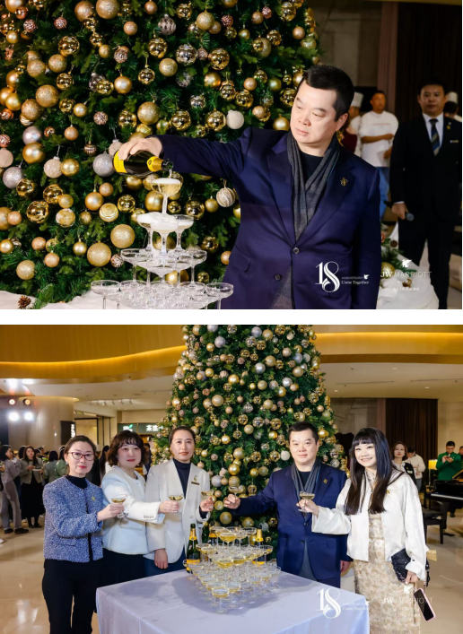 在重要仪式环节,陈彬董事长开启香槟塔并与酒店管理团队共同注杯,宾朋举杯共祝美好前景。随后,现场点亮圣诞树,配合灯光秀与钢琴演奏,将庆典氛围推向高潮。业主领导任总与酒店驻店经理苍总共同切开寓意根基深厚、美好绵长的树根蛋糕,象征酒店稳健发展、共期未来。