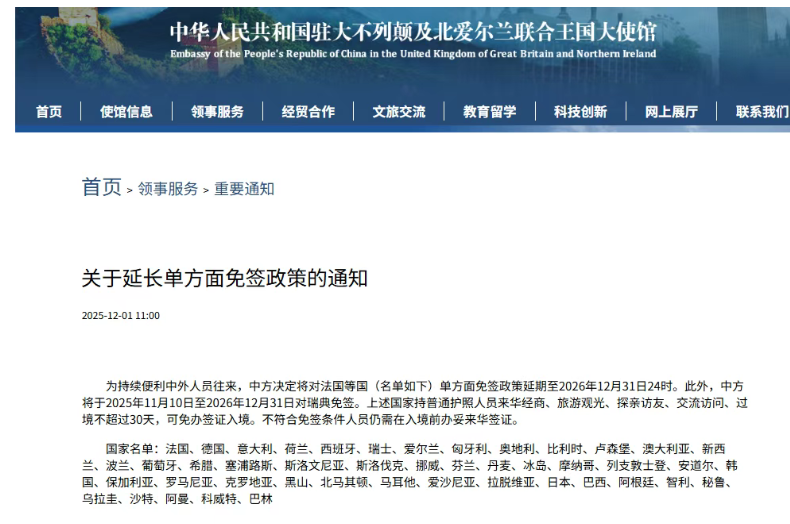 2025年底,中方已将对法国等国的单方面免签政策延期至 2026 年底。