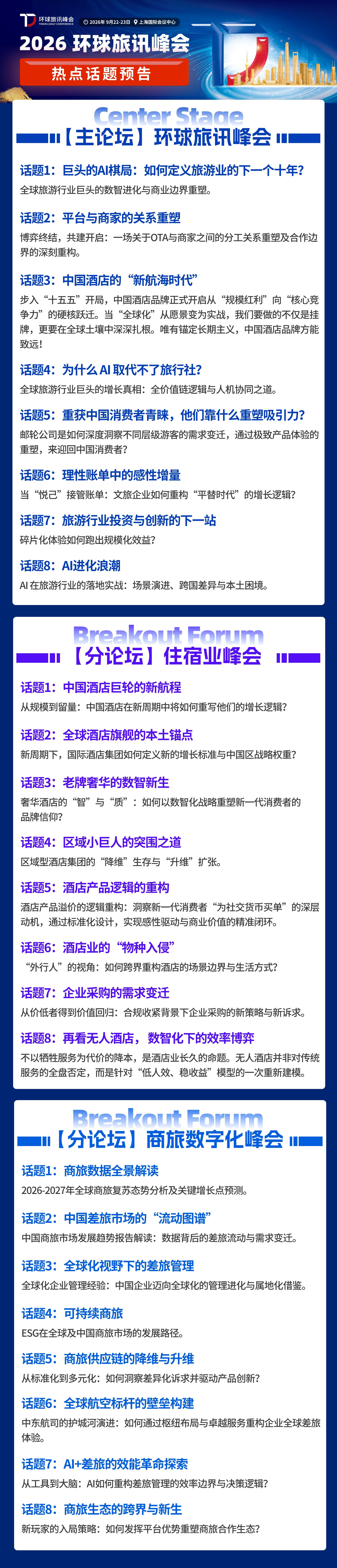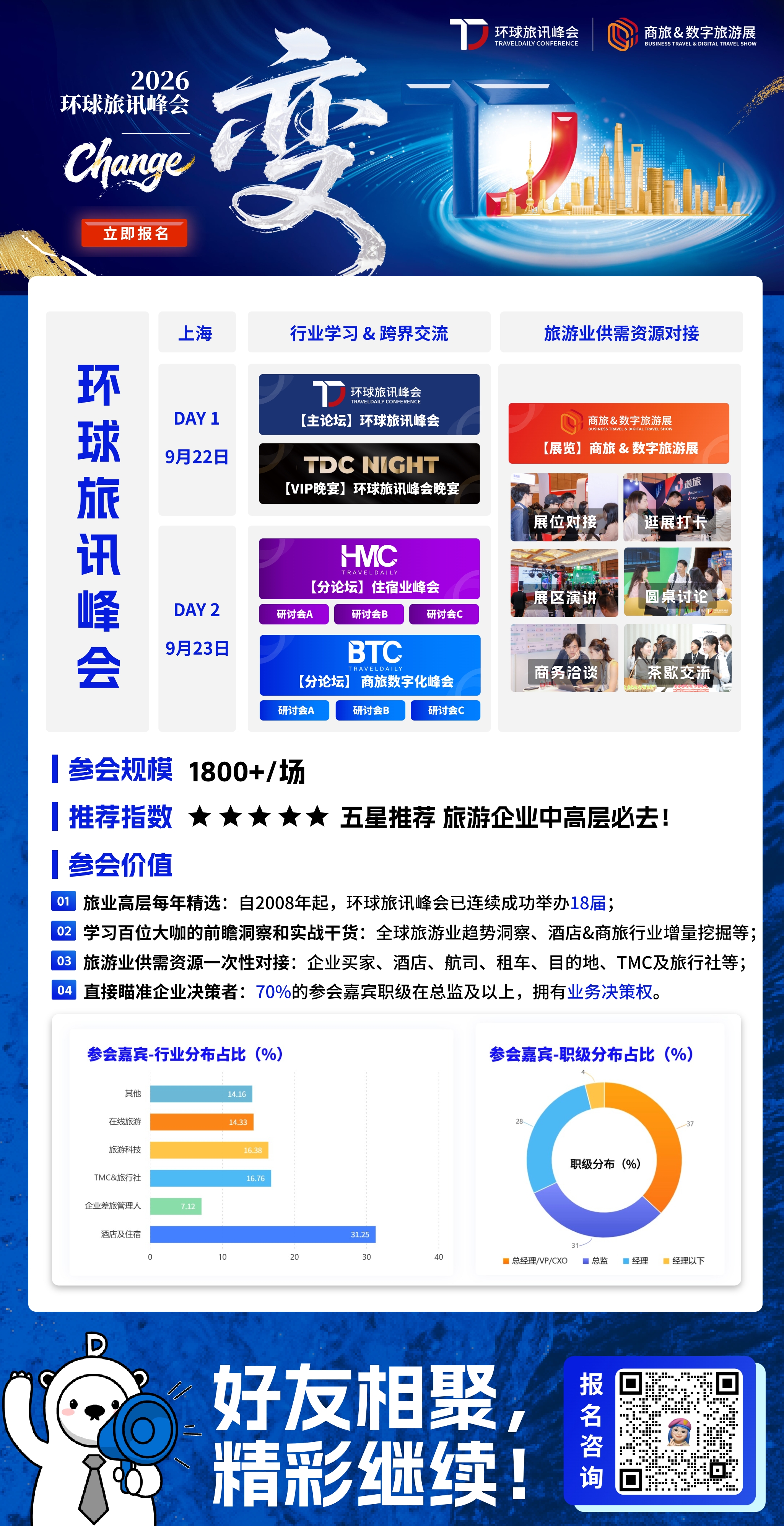 2026 环球旅讯峰会 将于9月22-23日在上海国际会议中心举办,我们诚邀您一起,共同探索新世代、商旅客、银发群体、入境游客、下沉市场人群等关键客群的旅游消费需求变化,及新需求驱动下的产品&营销&运营模式的创新与变化。