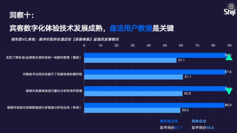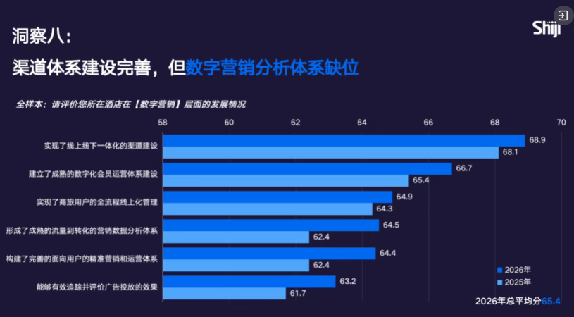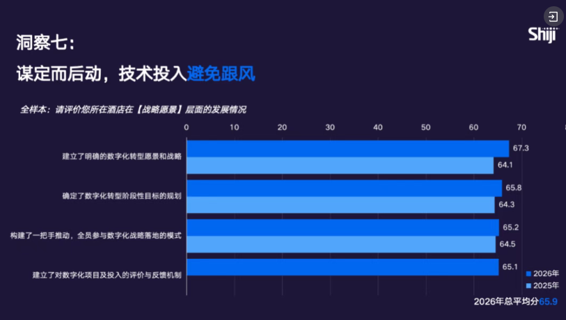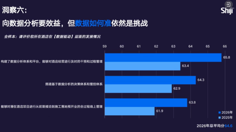 宾客体验是 8 大数字化维度中唯一成熟度同比下滑的维度,从 2025 年的 67.9 分微降至 2026 年的 67.3 分。尽管面向客人的智能技术已相对成熟,但无论领先企业还是其他企业,用户数据盘活不足都是最核心的瓶颈与挑战,这也是导致该维度得分下滑的关键原因。