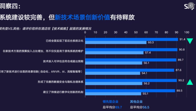 从【技术赋能】二级维度的得分来看,行业前后台系统云化已基本完成,技术基础设施成熟度较高,新技术预算投入占比持续提升,不再局限于原有系统维护。但AR/VR/AI等新技术的场景价值、ROI衡量仍未完全释放,即便是领先企业,新技术应用得分也处于各二级维度得分的最低水平,87.6分。