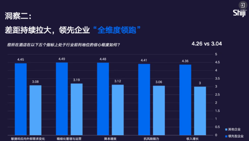 信心指数差距同样显著:领先企业行业地位信心均值4.4分,其他企业仅3.19分,差值1.35分,较去年继续扩大。