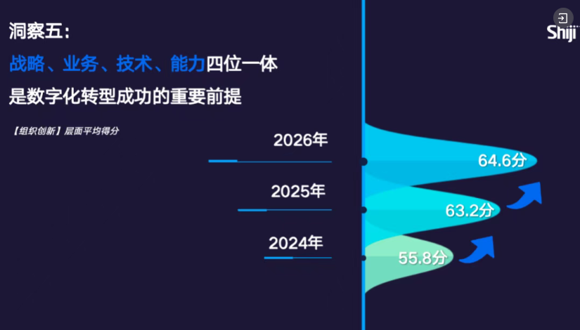 这里所指的组织创新,包含四项不可或缺的核心要素:一是营造鼓励创新、允许试错、快速适应变化的数字化企业文化;二是推动业务与技术深度融合、无缝衔接,让二者不仅方向一致,更能同频协同、合力攻坚;三是确保技术应用真正落地见效,产出可衡量的业务价值;四是持续推进数字化能力提升与专项培训,为长期转型筑牢人才根基。从行业整体数据来看,组织创新这一维度的成熟度连续多年保持稳步提升,行业在组织层面对数字化的适配与支撑能力正在不断增强。