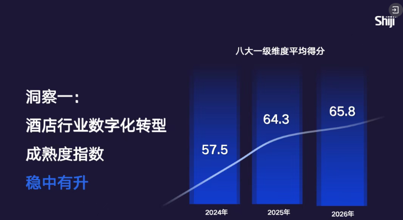2024-2026年,中国酒店业数字化成熟度指数呈现稳中有升的态势:2024年平均分为57.5分,2025年升至64.3分,2026年持续提升。8大一级维度中,除宾客体验外,其余7大维度成熟度均实现同比增长。