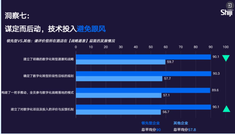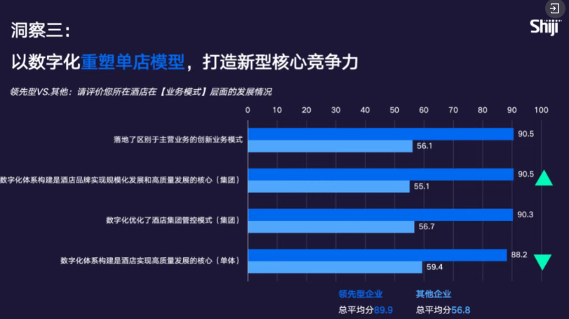 通过对比可见,领先型企业在组织创新维度的平均分达到 89.4 分,而其他企业仅为 56.3 分,二者存在十分显著的差距。其中,数字化能力培训是领先企业与其他企业差距最大、且差距持续拉大的关键指标。站在酒店集团视角,培训将成为未来几年的重中之重,因为酒店集团的核心竞争力与盈利来源正是能力输出。只有通过持续培训强化集团各职能部门的数字化能力,才能更好地向下赋能单店、提升人效、推进集约化管理,最终形成 “集团强能力、单店高效率、业主增价值” 的良性闭环。
