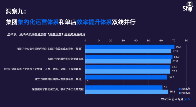 行业高效运营维度成熟度持续稳步提升,从 2024 年的 61 分、2025 年的 66.5 分,升至 2026 年的 67.3 分。但在内部自动化工具替代手工流程方面,行业整体成熟度依然偏低,即便领先企业表现相对更好,多数酒店仍未通过数字化工具真正实现流程重塑。