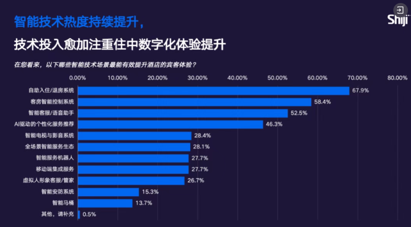 在本次报告中,我们还调研了行业对提升宾客体验的智能化技术场景的看法。从调研结果来看,行业智能技术投入 TOP5 集中在:自助入住 / 退房、智能客控、智能客服 / 语音助手、AI 驱动个性化服务、智能电视与影音系统。关于客交互入口,行业存在 “分散化” 与 “统一化” 两种观点,而以电视为智能中枢、依托 AI 大模型与虚拟人的统一入口方案已出现,代表了未来对客服务入口整合的重要方向。归根结底,智能硬件落地只是基础,能否真正盘活宾客数据、用数据驱动服务升级,才是酒店做好宾客体验的核心关键。