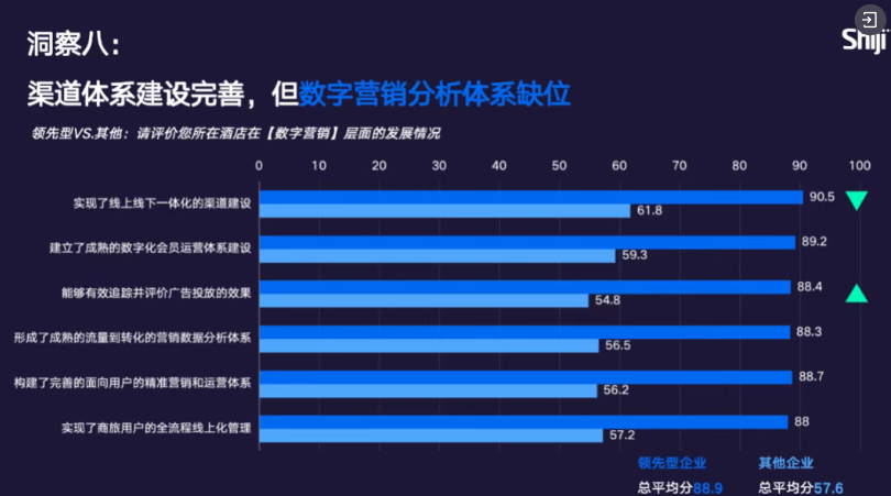 从二级维度得分数据来看,单体酒店数字化差距极大:领先单体酒店已进入组织变革阶段,部分酒店仍未实现PMS系统云化,前后台系统未打通。