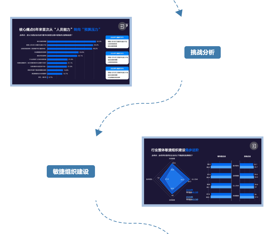 此外,报告还深度展示了领先型企业成功要素、信心程度与行业技术投入意愿及成效、挑战、数字化目标,以及行业在敏捷组织4大一级维度、20个二级维度的具体发展情况。
