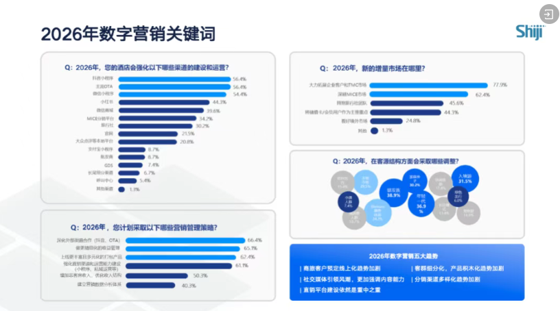 2026 年酒店数字营销增量市场与趋势清晰可见:渠道建设 TOP3 为抖音小程序、主流 OTA、微信小程序,小红书生态开放度持续提升,抖音流量与核销率大幅上涨;企业客户与 TMC 市场成为重要增量,MICE 市场持续深耕。同时行业呈现三大趋势:一是商旅客户预订线上化持续加速;二是抖音、小红书等社交媒体成为关键阵地,内容营销能力至关重要;三是直销平台建设仍是重中之重,客群细分更加聚焦银发一族、家庭亲子、年轻一代,酒店需围绕细分客群提升产品打造与精细化投放能力,构成 2026 年数字营销的核心方向。