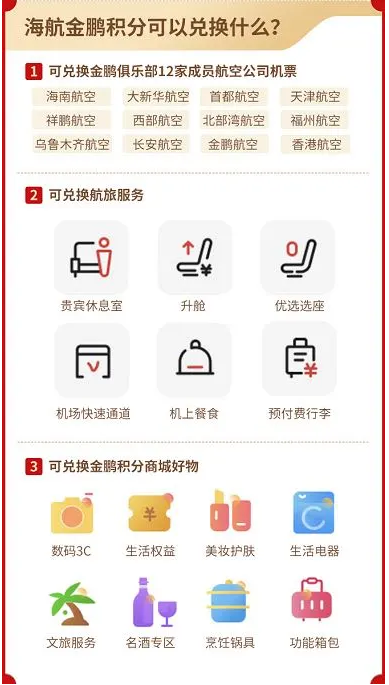 金鹏俱乐部则是新海航航空集团旗下海南航空、大新华航空、首都航空、天津航空、祥鹏航空、西部航空、北部湾航空、福州航空、乌鲁木齐航空、长安航空、金鹏航空和香港航空等12家成员航司共享的全球性常旅客奖励计划,为旅客提供完善、便捷的常旅客服务。根据合作方案,每1500个丽之呈联盟平台积分可兑换100个新海航金鹏积分。会员登录丽之呈联盟积分商城,即可兑换金鹏积分,积分可兑换奖励机票、公务舱升舱、优选座位、机场贵宾休息室、机上餐食、免费行李额及商城各类商品。