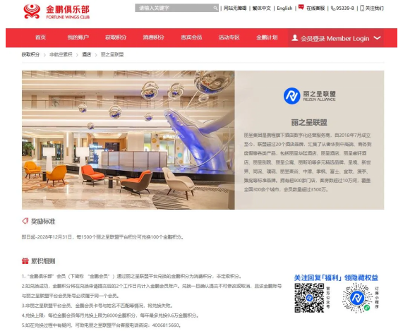 与此同时,金鹏俱乐部会员也可通过金鹏官网“获取积分”频道的酒店专区,领取丽之呈联盟专属预订折扣,预订全国范围内900余家丽呈集团旗下酒店。