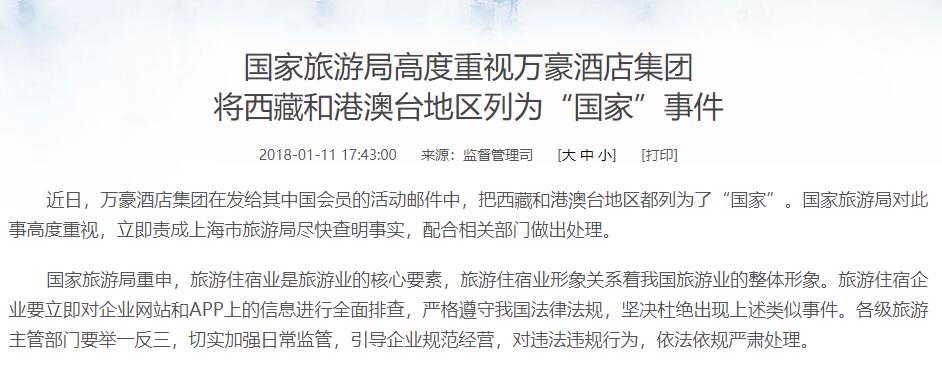 1月11日,国家旅游局官网发布《国家旅游局高度重视万豪酒店集团将西藏和港澳台地区列为“国家”事件》的公告称,万豪酒店集团在发给其中国会员的活动邮件中,把西藏和港澳台地区都列为了“国家”。国家旅游局对此事高度重视,立即责成上海市旅游局尽快查明事实,配合相关部门做出处理。