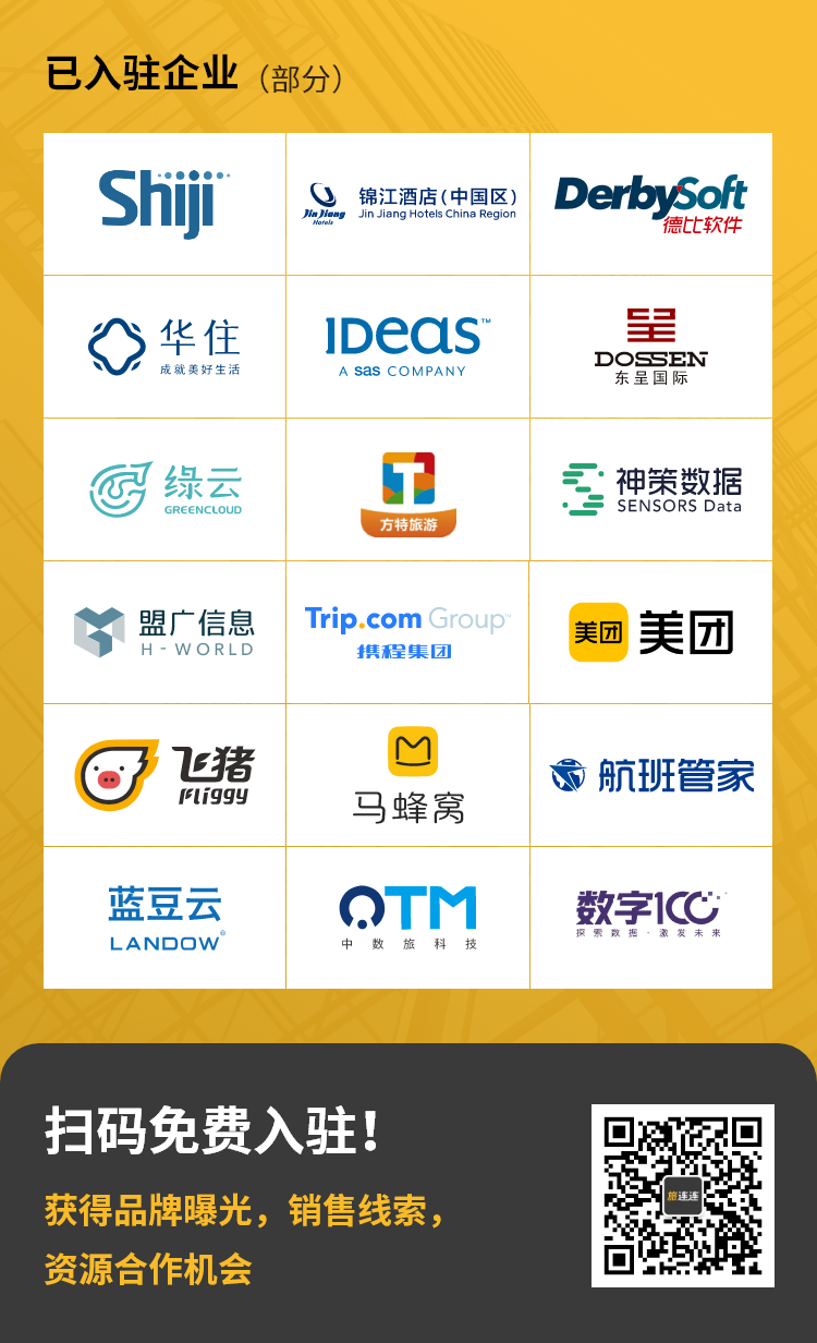 截止2021年3月,旅连连网站日均PV3000+,日均UV200+,入驻企业超过260家,45%的企业收到了来自行业用户的咨询,其中较为活跃的企业有石基信息、IDeaS、德比软件、方特等,这些企业入驻旅连连后均已获得品牌曝光、销售线索、资源合作机会。