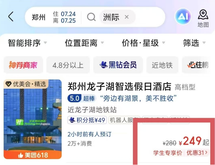 大四学生小范准备去郑州毕业旅行。他打开美团App查询发现,郑州龙子湖智选假日酒店7月下旬的“学生价”仅需200多元一晚。“从北京坐高铁去郑州非常便捷,订高星酒店又可享受学生价,这趟毕业旅行想想就开心”,小范对旅途充满期待。