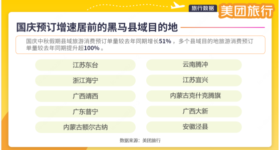 ▲美团旅行数据显示,国庆中秋假期多个县域目的地预订单量较去年同期提升超100%