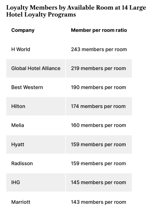 旅游媒体Skift最近发布了一个有意思的酒店忠诚度排行榜,它不按会员总数排名,而是换了一个新维度——“每间客房对应的会员数”。