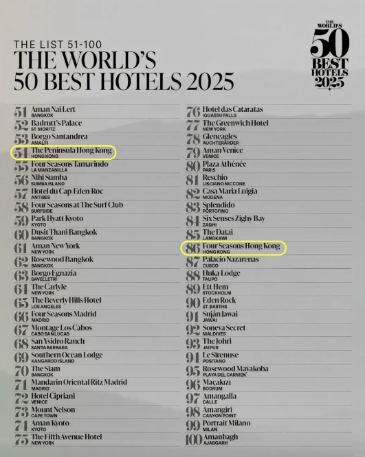 与前两届榜单不一样的是,今年50 Best榜单还扩充了51-100的排名,其中,香港半岛排名54名,香港四季86名。