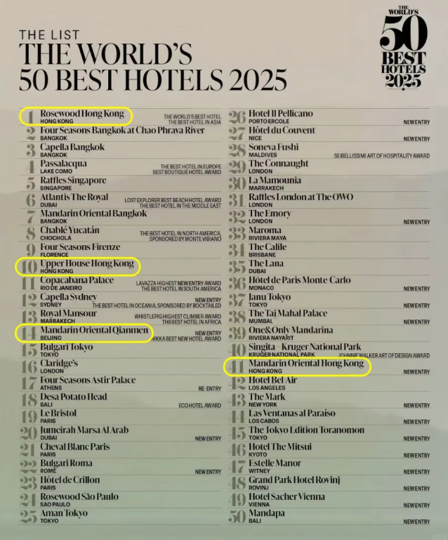 2025 年全球最佳榜单《The World's 50 Best Hotels 2025》近日发布,香港瑰丽酒店从2024年的第3名跃升至第1位,成为首个斩获该榜单榜首的中国酒店,同时将“亚洲最佳酒店”称号收入囊中。