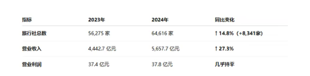 进一步来看,旅行社行业正在经历一场“寒冬”:文旅部数据显示,2024年末全国旅行社数量突破6.4万家,同比增长14.8%,但平均每家的年营业利润换算下来不足6万元。