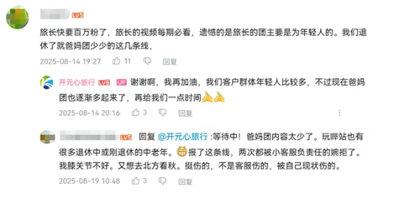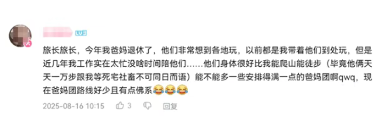 甚至还有孝顺的年轻人跟着呼吁:“旅长旅长,今年我爸妈退休了,他们非常想到各地玩...身体很好,能不能多安排一些爸妈团啊。”