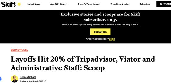 据旅游媒体Skift报道,全球最大的旅行指南平台Tripadvisor(猫途鹰)将在其Tripadvisor品牌、Viator和行政岗位上裁员约20%。