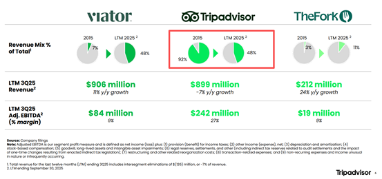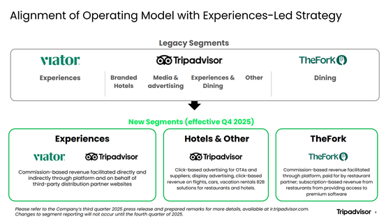 公司最近在第三季度财报中表示,其核心品牌 Tripadvisor 虽然仍保持盈利,但规模正在收缩[4] 。未来,该品牌将“转向支持体验业务和数据战略,同时精简传统业务组合,以提升盈利能力。”