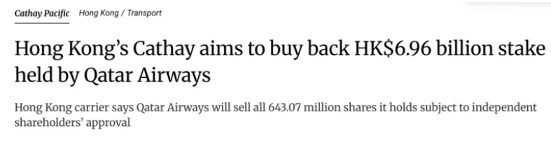 香港国泰航空宣布,计划以约69.6亿港元(约合8.96亿美元)回购卡塔尔航空所持全部股份,此举需获得国泰独立股东批准。