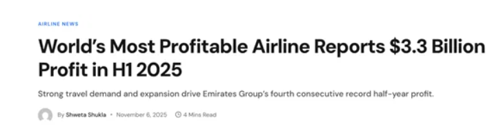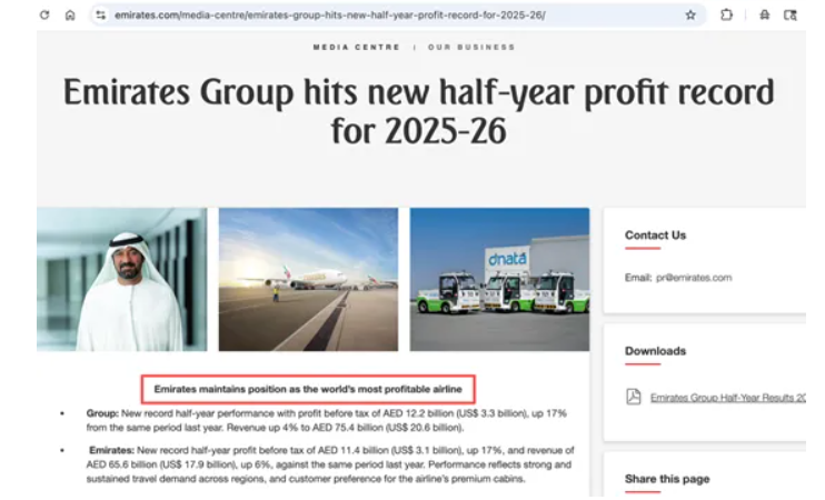 阿联酋集团(Emirates Group)近日公布,2025-26财年上半年税前利润达到122亿迪拉姆(约合33亿美元),实现连续四个半年度的历史新高。税后净利润为106亿迪拉姆(约合29亿美元),同比增长13%。