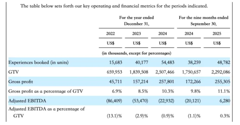 招股文件显示,Klook在2024年收入达到4.171亿美元,同比增长24.4%。2025年前九个月收入已达4.074亿美元,净亏损1.415亿美元;同期调整后EBITDA(息税折旧摊销前利润)为628万美元。