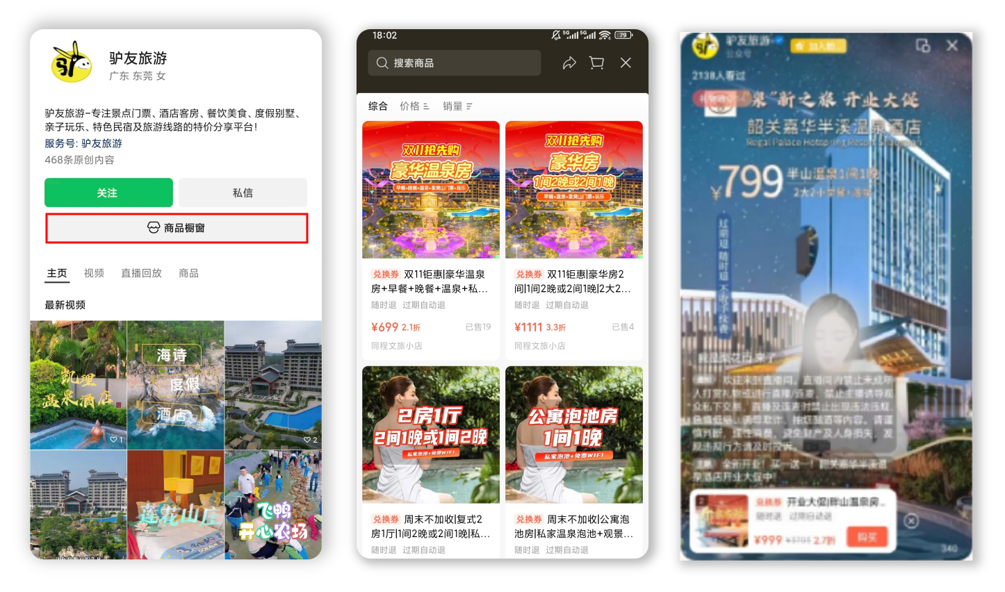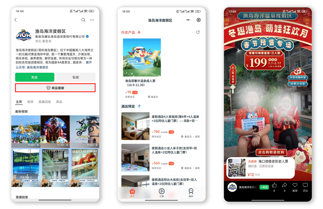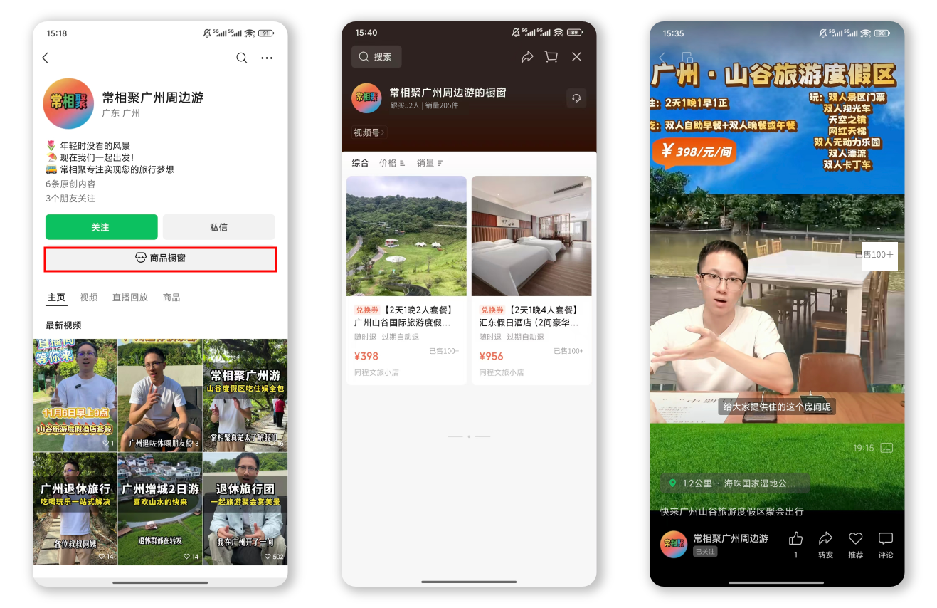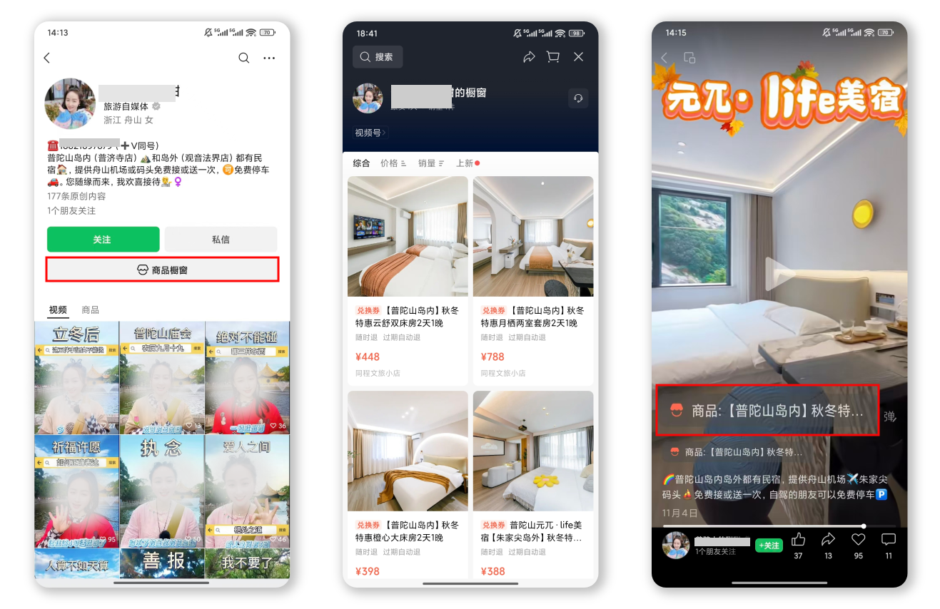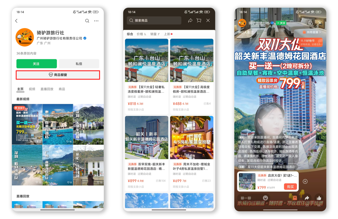 酒店官方视频号可通过橱窗、短视频、直播挂载商品自营带货;也可分发至酒店集团矩阵账号、合作达人账号,实现多渠道分销。