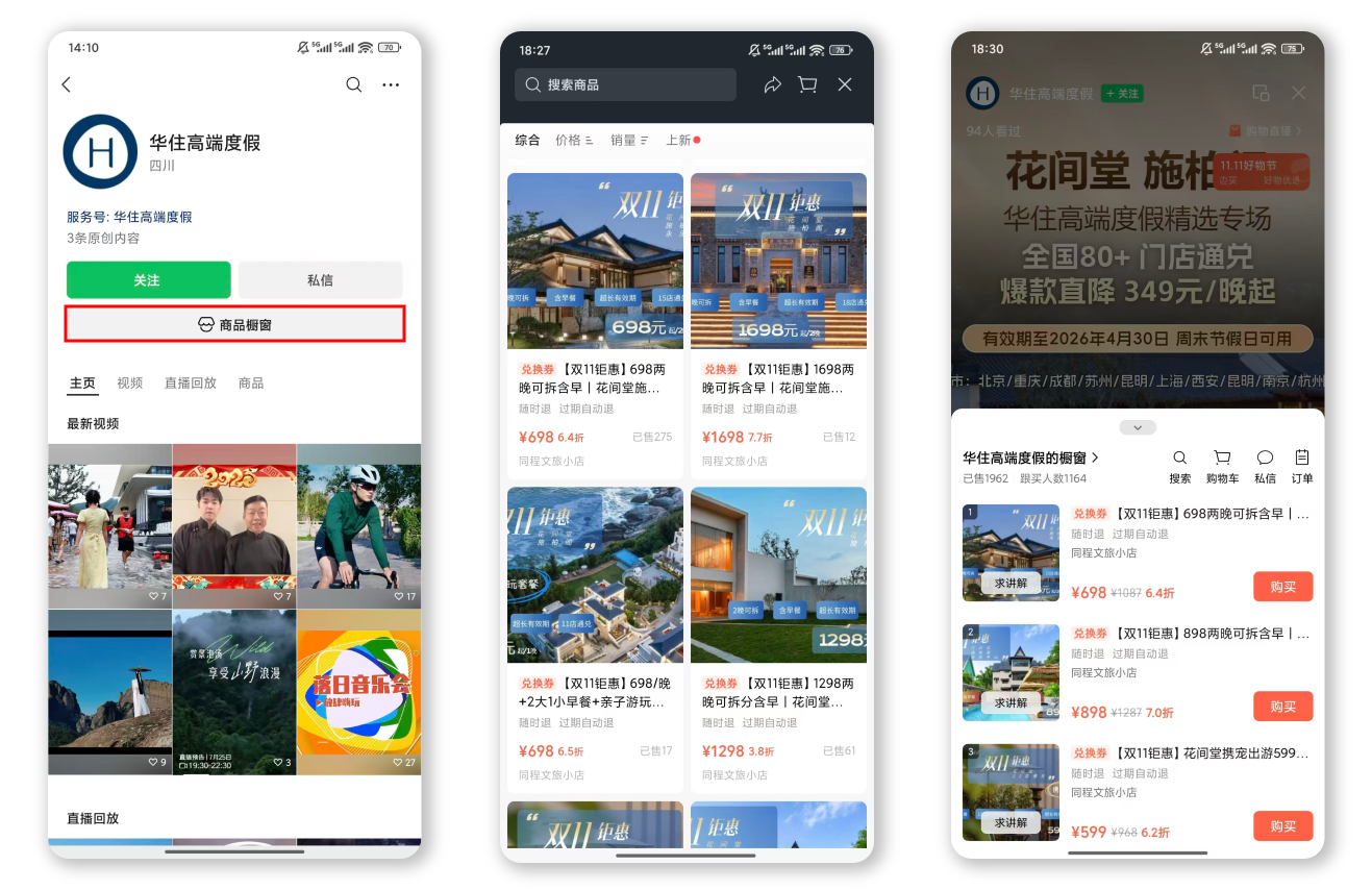 3.酒店民宿:无需专业运营团队,一键开通视频号橱窗、挂载房态/套餐,用户可直接交易;酒店集团可通过统一后台批量上架多品牌套餐,房态自动同步 PMS,规避超售风险。
