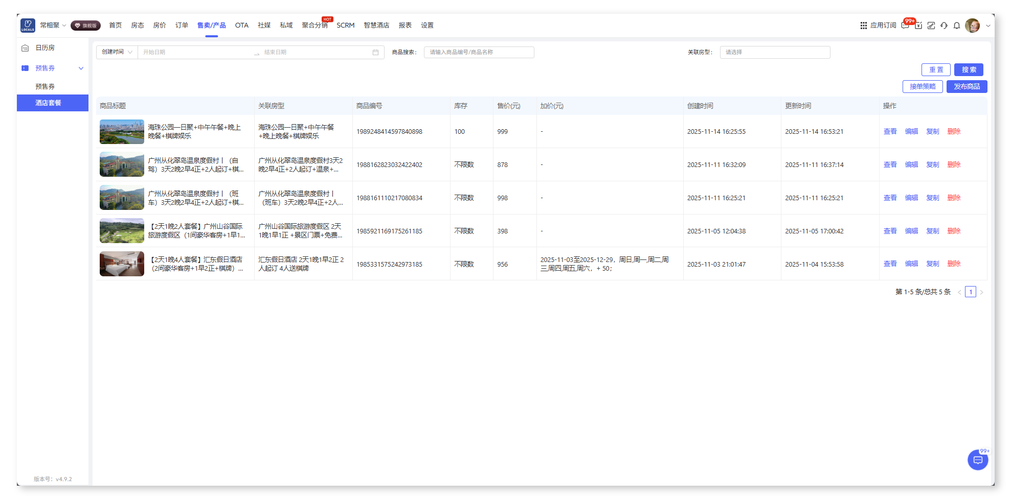 酒店可上线预售券、酒店套餐等丰富产品,适配不同营销场景。