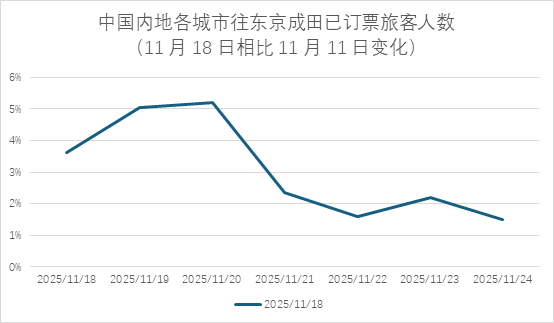 事实上,直到今天退票仍在继续。我们以2025年11月18日到2025年11月24日出发的航班在2025年11月11日的旅客人数(作为100%)和在2025年11月18日的旅客人数为例。
