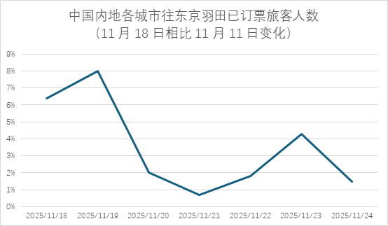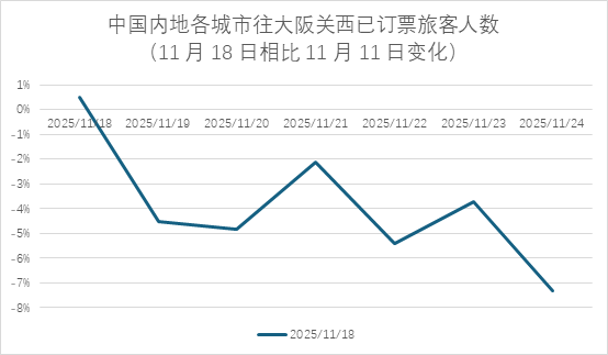 在旅行警告和免费退票措施刚刚出来的两天(2025年11月15日到2025年11月17日),有约49万名旅客取消了其计划的日本行程。2025年11月15日,约有155万名旅客计划前往日本;到了11月17日,这一数字急剧减少到106万人,减少了32%。