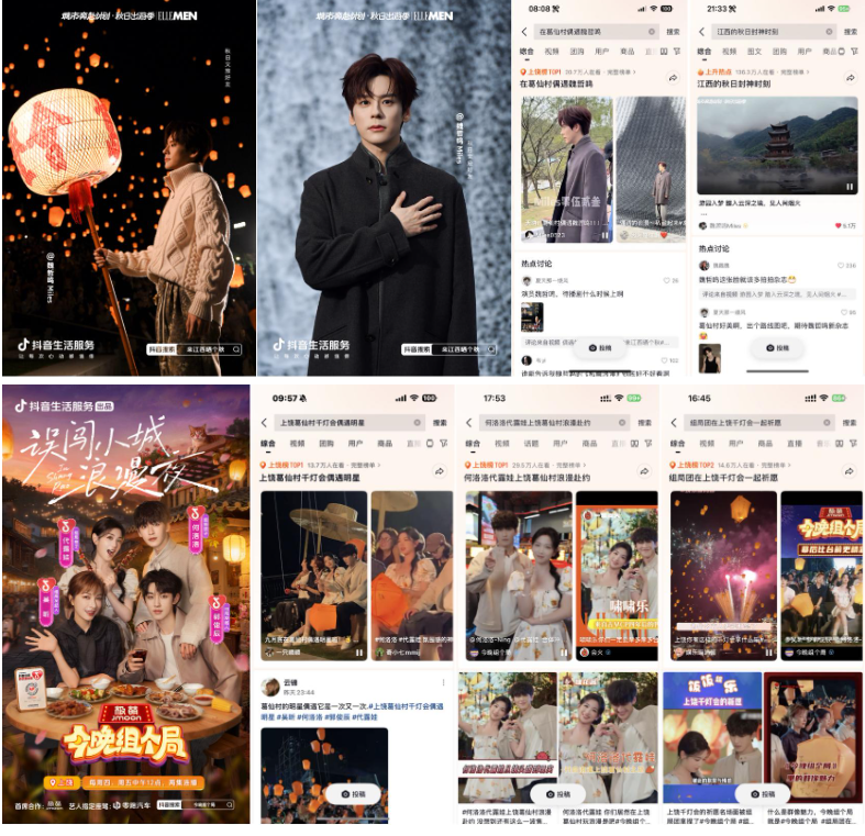 抖音牵手“秋日男友”魏哲鸣前往江西上饶葛仙村拍摄文旅宣发视频引发广泛关注,路透内容#在葛仙村偶遇魏哲鸣 登上上饶同城榜TOP1;主视频发布后,#江西的秋日封神时刻 更登顶同城榜及全国种草榜TOP6。活动还与综艺《今晚组个局》实现联动,吴昕、代露娃、郭俊辰、何洛洛等明星演员前往上饶拍摄定制化文旅内容,#上饶葛仙村千灯会偶遇明星 #何洛洛代露娃上饶葛仙村浪漫赴约 等路透内容与节目看点登顶上饶同城榜TOP1,#组局团在上饶千灯会一起祈愿 抢占同城榜TOP2。明星效应有效激发用户出行意愿,葛仙村交易额同比403%显著增长,持续引爆目的地&商家出圈。