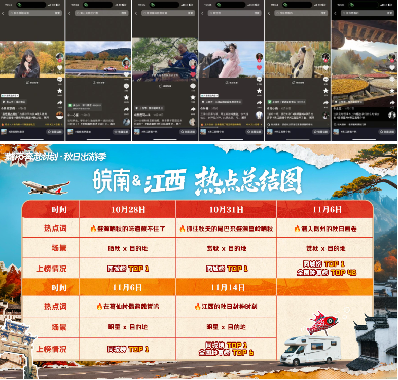 50余位跨界及垂类达人共同参与秋季种草内容创作,整体曝光量突破千万级别,覆盖江西上饶、安徽黄山15家重点头部商家,以多元化的内容视角与持续的内容输出,形成从点到面的内容爆发态势,推动江西#婺源晒秋的味道藏不住了 、安徽#潜入徽州的秋日画卷 等城市赏秋热点上榜,让江西与安徽两地秋景,以更生动的方式呈现在用户面前。