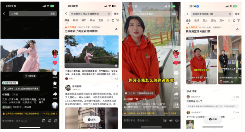 平台结合江西上饶景区特色文化,首次创新联动传统武术达人在三清山以“山间舞剑”创意演绎武侠意境,话题#仿佛看到了周芷若踏峰舞剑 上线3日内火速获赞4.8万,商家抖音详情页曝光量超9000次,2周内搜索UV与GMV分别实现48%与74%的环比增长。文旅创意达人则在鹿鸣谷以“薅羊毛”趣味视角诠释商家特色,#挑战用宣传片换门票 等亮点策划有效激发用户互动,2周内推动搜索GMV环比提升72%。
