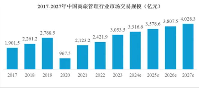根据艾瑞咨询统计,我国商旅管理市场的交易规模在2023年超过2019年水平,达到3053.5亿元,且预计2023年至2026年期间保持平稳增长态势,复合增长率为7.63%。